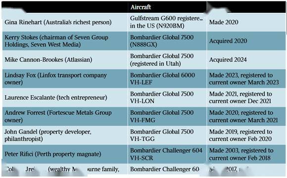 富豪榜上榜者占据主导地位,采矿大亨Andrew Forrest和房地产开发商兼慈善家John Gandel是为数不多拥有庞巴迪环球7500飞机的人。